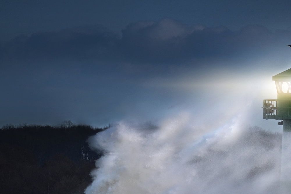 Leuchtturm bei Sturm in nächtlicher Gischt auf der Ostsee, Travemünde in der Lübecker Bucht, Kopierraum