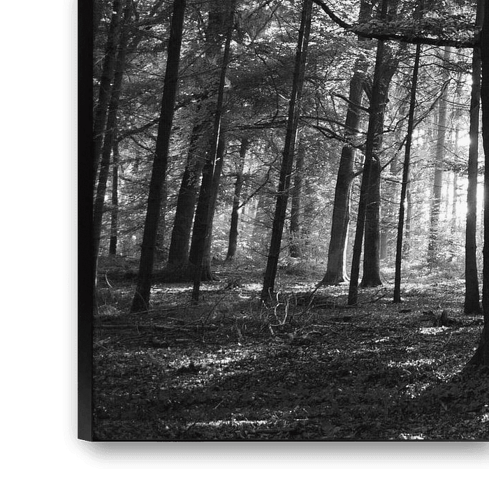 Das Schwarz-Weiß-Foto zeigt den Leursener Wald in einer ruhigen, fast zeitlosen Atmosphäre. Hohe Bäume erheben sich zu beiden Seiten eines schmalen Weges, der sich in der Ferne verliert. Der Kontrast zwischen Licht und Schatten ist stark: Das Sonnenlicht bricht durch die Baumkronen und zeichnet weiche Flecken auf den Waldboden. Ohne Farbe liegt die Betonung auf Formen, Linien und Texturen, der rauen Rinde der Stämme, dem feinen Muster der Blätter und der nebligen Luft, die zwischen den Ästen hängt. Die Stille scheint fast hörbar zu sein; es herrscht ein Gefühl der Ruhe, aber auch ein Hauch von Geheimnis, als ob der Wald ein Geheimnis hütet. Das Foto fängt nicht nur eine Landschaft ein, sondern auch eine Stimmung: einen Moment der Kontemplation und der Verbundenheit mit der Natur, losgelöst von Zeit und Jahreszeit.