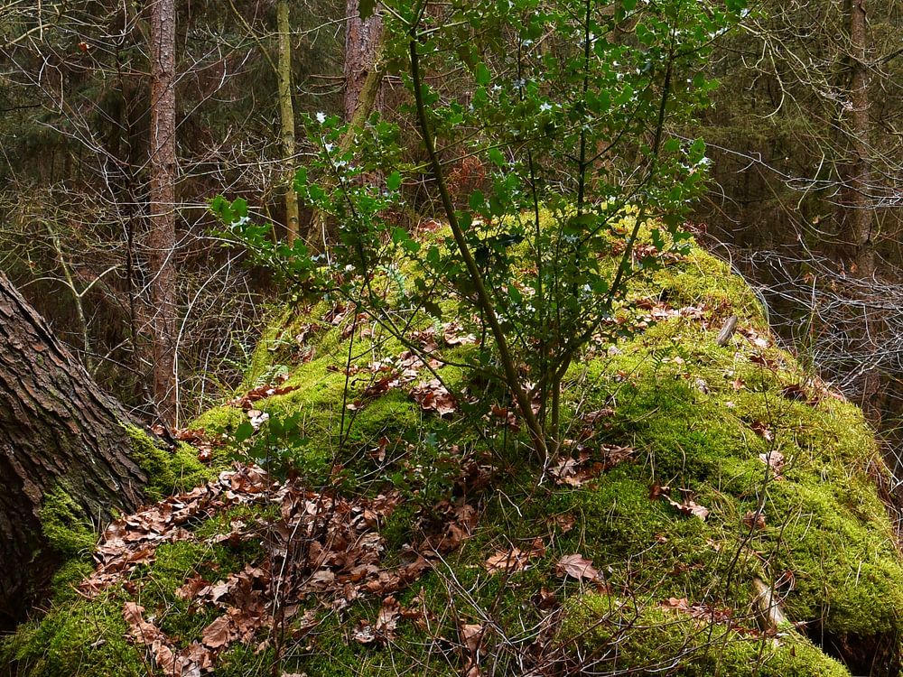 Nieuw boompje groeit uit omgewaaide oude boom.