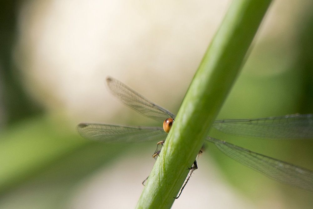Nur die Augen und Flügel der Libelle sind zu sehen.
