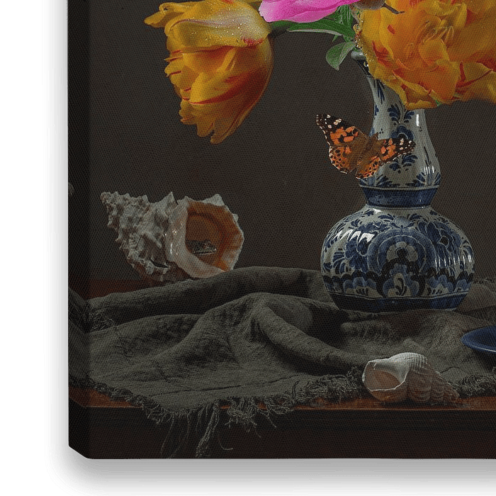 Stilleben im Stil der niederländischen Meister mit einer Delfter blauen Vase mit Tulpenpfingstrosen und Rittersporn mit versteckten Insekten. Im Vordergrund ein blauer Teller mit Zitronen und hinten links eine große weiße Muschel.