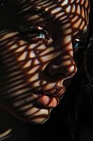 Dieses beeindruckende Portrait einer Frau fängt die faszinierenden Schattenspiele ein, die durch ein kompliziertes Muster auf ihr Gesicht geworfen werden. Die kunstvollen Licht- und Schatteneffekte verleihen dem Bild eine geheimnisvolle und tiefe Atmosphäre, während ihr intensiver Blick durch die Dunkelheit hindurchstrahlt. Perfekt für…