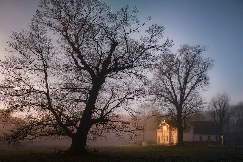 Das Kutschenhaus des Landguts De Lichtenbeek in Arnheim erwacht an einem nebligen Morgen im April. Die ersten Sonnenstrahlen streifen die Fassade. Alte Bäume stehen wie Wächter um dieses besondere Landgut herum. Der Beginn eines neuen Tages.