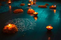 In sanftem Licht erstrahlen kleine Öllampen und leuchtende Blumen, die eine harmonische Atmosphäre kreieren. Prächtige Rangoli-Muster elegant auf dem Boden verteilt, laden zum Verweilen und Entspannen ein. Diese friedliche Szenerie eignet sich perfekt für ein Schlafzimmer, wo sie Ruhe und meditative Harmonie fördert.