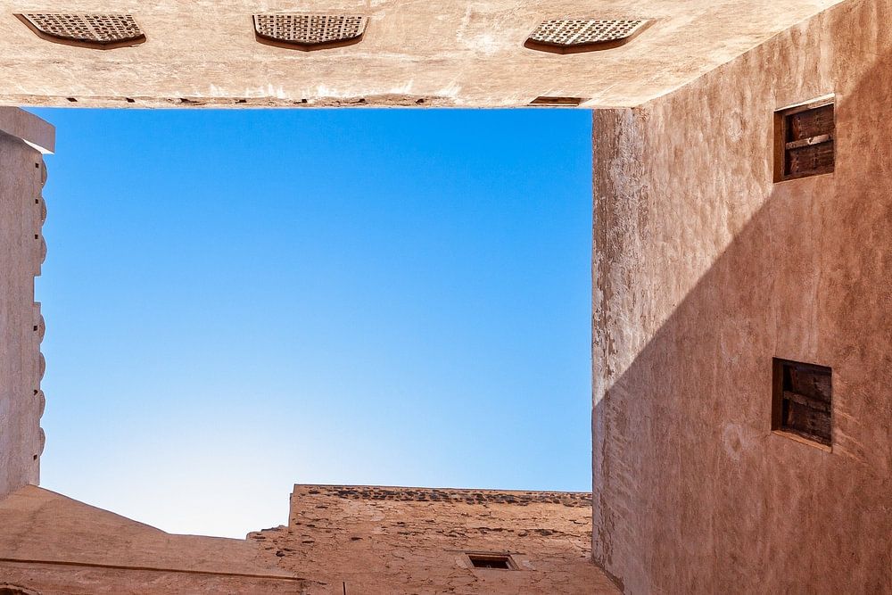 Blick in den Himmel in einem Innenhof einer Lehmfestung im Oman