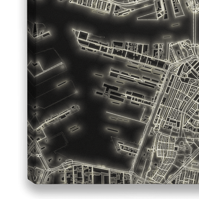 Eine stilisierte Karte von Rotterdam (oder besser gesagt, das Stadtzentrum und die umliegenden Stadtteile), in dem die Stadt erscheint als ein Netz von helle Linien, Flächen und Punkten vor einem schwarzen Hintergrund.
