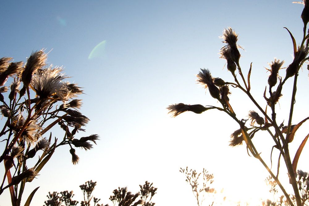 Dünenpflanzen gegen einen blauen Himmel mit einer Lichtkuppel.