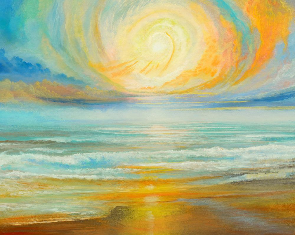 Dieses Gemälde präsentiert eine fesselnde Szene, in der eine riesige Lichtspirale in den Wolken den Himmel dominiert. Diese spiralförmige Erscheinung in den Wolken zieht die Aufmerksamkeit auf sich. Die Spiralform erzeugt eine eigenwillige Dynamik und vermittelt den Eindruck von Bewegung und Energie im Himmel.