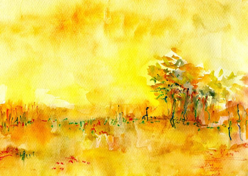 Aquarellmalerei einer lichtdurchfluteten Landschaft in Gelb...