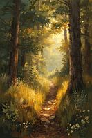 Ein heller, sanft beleuchteter Waldpfad, gesäumt von zarten Pflanzen und Blumen. Das weiche Morgenlicht durchflutet die Szene und schafft eine friedliche, fast märchenhafte Atmosphäre. Ein harmonisches Kunstwerk, das positive Energie und natürliche Schönheit in jeden Raum bringt.