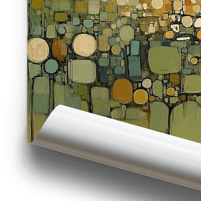 Dieses abstrakte Gemälde fängt eine lebendige Naturszene in einem Mosaik aus Kreisen und Quadraten ein. Gold und helle Töne oben gehen in tiefere Grüntöne unten über und erinnern an einen Sonnenaufgang in einem Wald. Geometrische Formen erzeugen einen dynamischen Rhythmus, wie tanzende Blätter oder Lichtreflexionen. Das Werk balanciert…