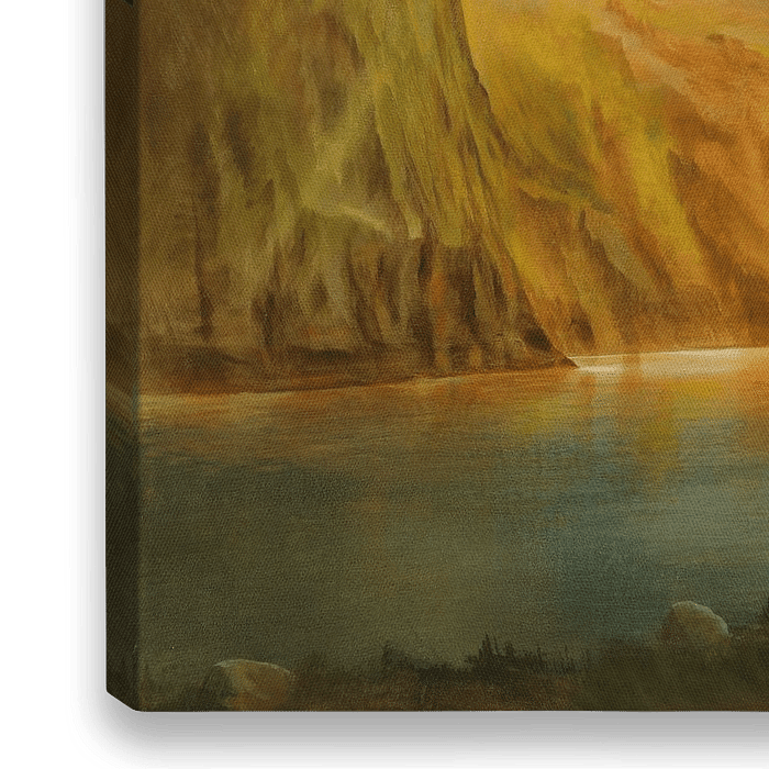 Dieses Gemälde präsentiert eine atemberaubende und goldene Landschaft, die von der unberührten Schönheit der Natur geprägt ist. Es zeigt ein verborgenes Tal, das von erhabenen Bergen umgeben ist und in dessen Mitte ein scheinbar unentdeckter See liegt. Diese Szenerie ist von einer beeindruckenden Ruhe und Stille durchzogen.