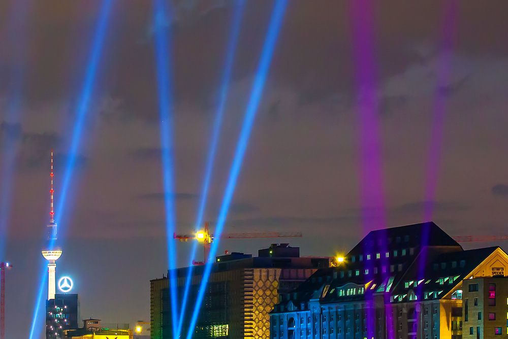 Die Berliner Skyline an der Spree im alten Osthafen (heute ein modernes Bürovirtel): Zahlreiche Schiffe mit starken scheinwerfern befahren anlässlich einer Veranstaltung die Spree.