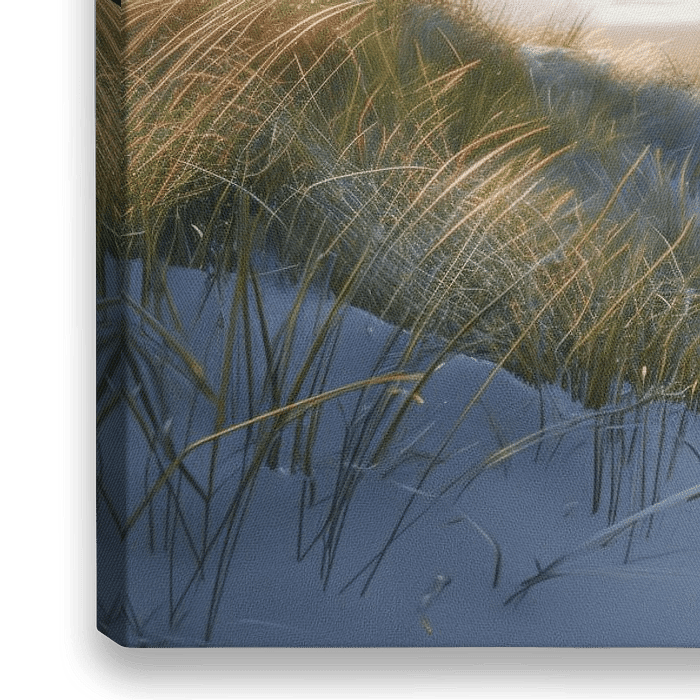 Dieses Bild ist eines aus einer größeren Serie. Die Bilder zeigen eine Strandlandschaft mit Dünen und wogendem Gras. Das Lichtspiel der Sonne zwischen den Wolken erzeugt einen dynamischen Schatten- und Lichteffekt über dem Sand und dem Meer. Die Wellen rollen sanft an den Strand, während der Himmel mit weichen Wolken gefüllt ist, durch…