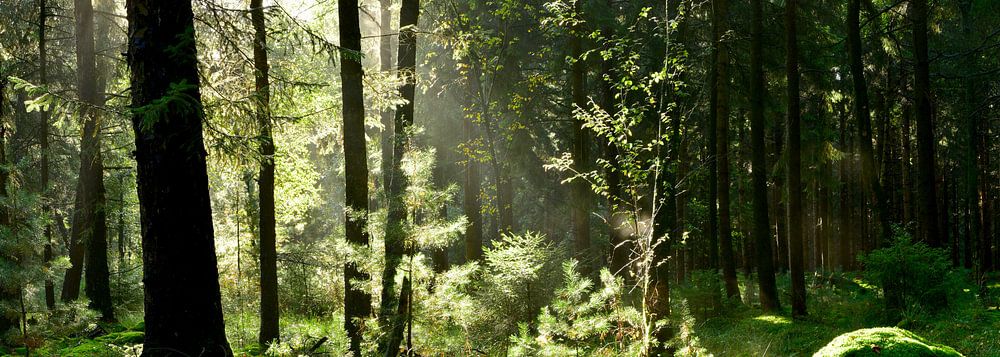 Moosbedeckter Waldboden, Sonnenstrahlen im Nebel - ein schöner Morgen im Wald.