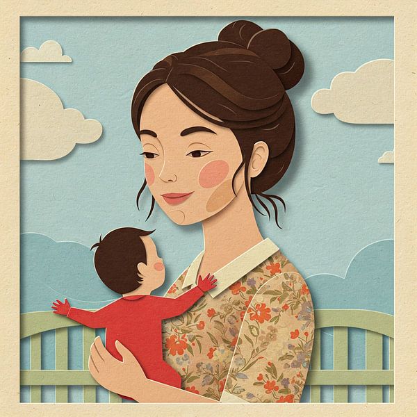 Süßes und elegantes Scherenschnitt-Design einer Mutter, die ihr Kind in warmen Pastelltönen hält.