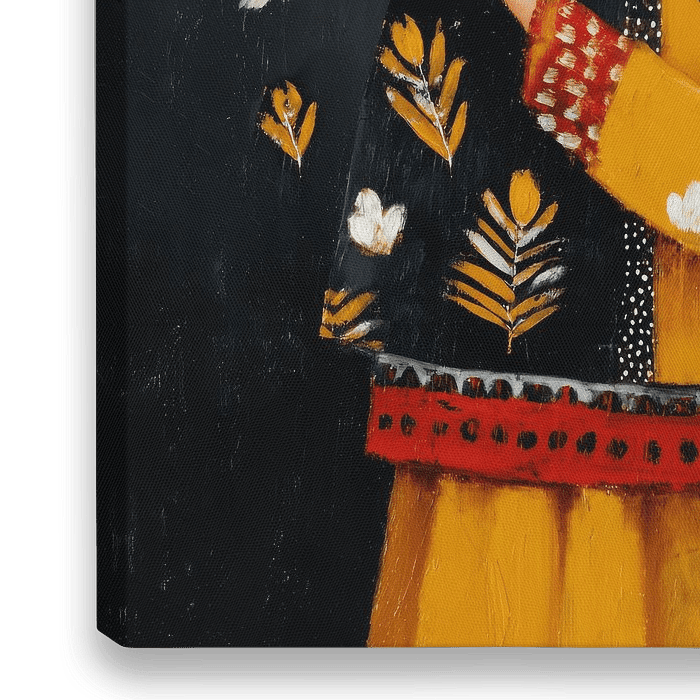 Ein liebevolles und verträumtes Frauenporträt mit einem weißen Vogel als Symbol für Frieden, Freiheit und Verbundenheit. Die Frau lehnt sich mit geschlossenen Augen sanft an den Vogel, als würde sie in der Stille ein Geheimnis teilen. Der tiefdunkelblaue Hintergrund macht das Bild intim und kraftvoll, während die warmen ockergelben Töne…