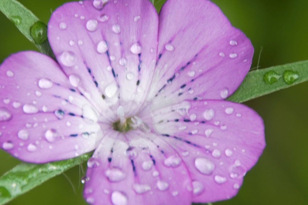 Diese schöne lila Blume wurde nach einem Regenschauer fotografiert. Die Regentropfen sind noch deutlich sichtbar.