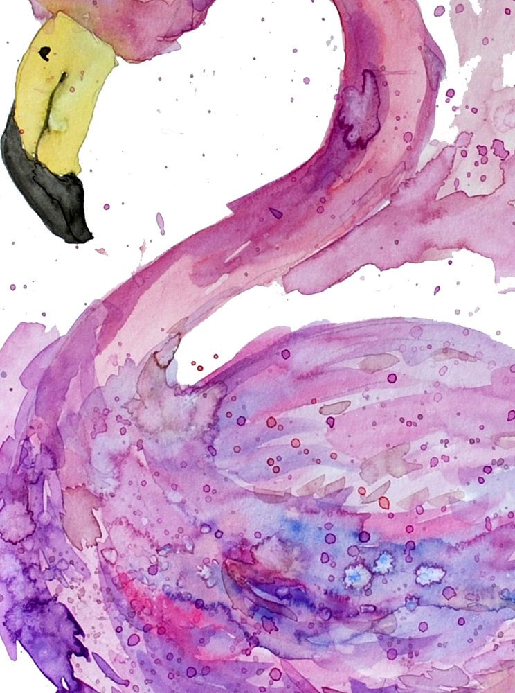 traditionelles Wasserfarben Kunstwerk von einem lila und pink farbigen Flamingo.