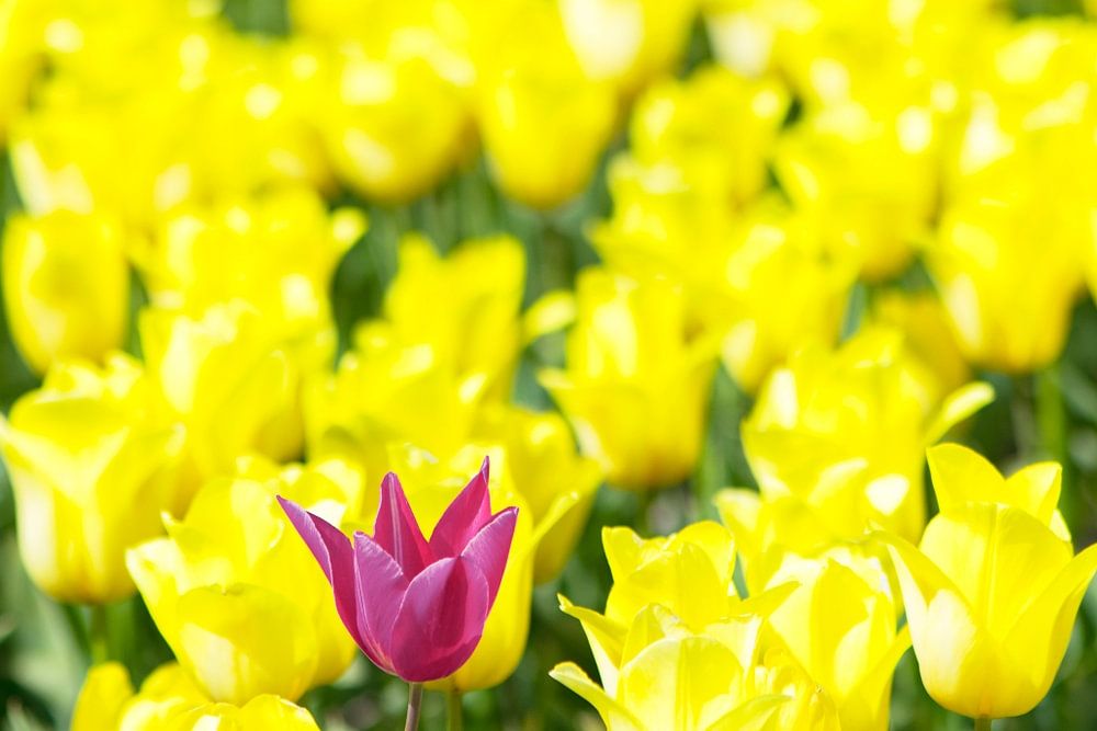 Gelbe Tulpen auf landwirtschaftlichen Feldern im Noordoostpolder in Flevoland, Niederlande, im Frühling, von oben gesehen, mit einer Tulpe in der Mitte der gelben Tulpen.
