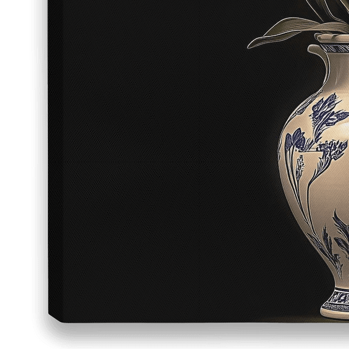 Dieses Bild zeigt ein wunderschönes Stilleben eines Blumenstraußes aus beurteilten Tulpen in einer schönen dekorativen Vase. Die Tulpen haben satte violette Töne mit cremefarbenen und rosa Akzenten, und grüne Blätter umrahmen die Blumen. Die Vase ist aus Keramik in klassischer Optik gefertigt und mit blauen Blumenmustern verziert, die…