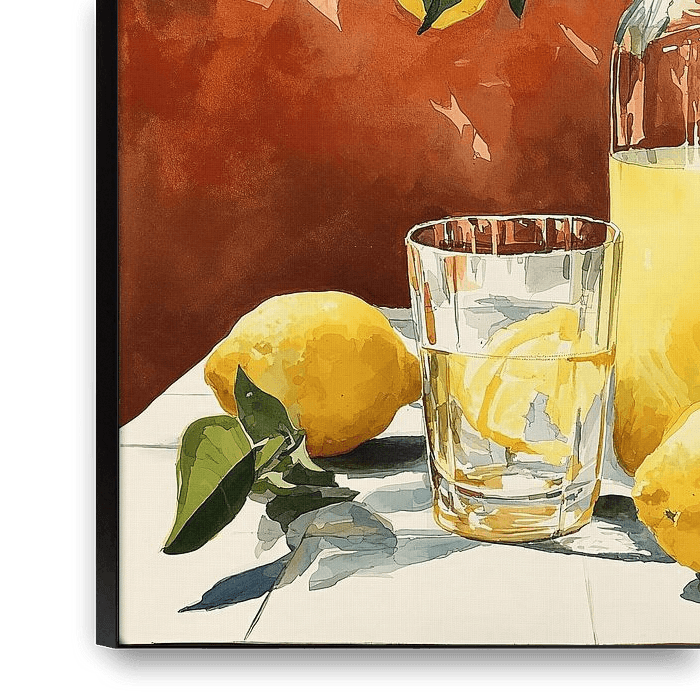 Eine Aquarellillustration eines Sommerstilllebens mit reifen Zitronen auf einem Zweig und auf einem Tisch, begleitet von einer transparenten Flasche gelber Limonade und einem leeren Glas. Der warme Terrakotta-Hintergrund und das Spiel von Licht und Schatten schaffen eine mediterrane Atmosphäre, die an einen sonnigen italienischen…