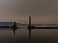 Aufnahme des Leuchturms und des Lindauer Löwens mit Spiegelungen im Hafenbecken in Lindau am Bodensee, Deutschland mit düsterem, leicht orange verfärbtem Himmel aufgrund eines seltenen Wetterphänomens (Saharastaub in der Luft).