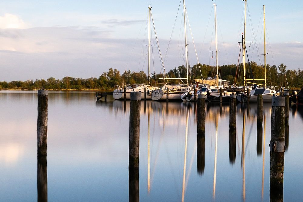 Der Abend kommt leise über den Hafen in Koudum. Die schönen Reflexe im Wasser ergeben ein schönes Linienspiel,