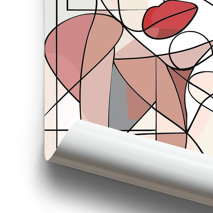 Bild eines Frauenporträts, das durch dünne schwarze Linien entsteht. Die spontan entstandenen Flächen sind mit den Farben Rot, Terra, Braun, Beige, Grau und Grün koloriert. Passt zu verschiedenen Stilen und Trends, darunter Modern Abstract und Linienzeichnungen. Künstlerin: Bianca ter Riet