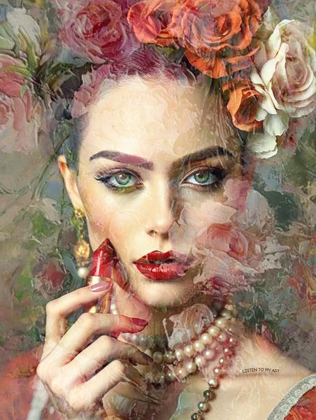 Mit roten Rosen auf dem Kopf und Verführung in der Hand wählt diese Dame ihre eigene Farbe. Die Rosen stehen für Romantik, der rote Lippenstift für Verführung.