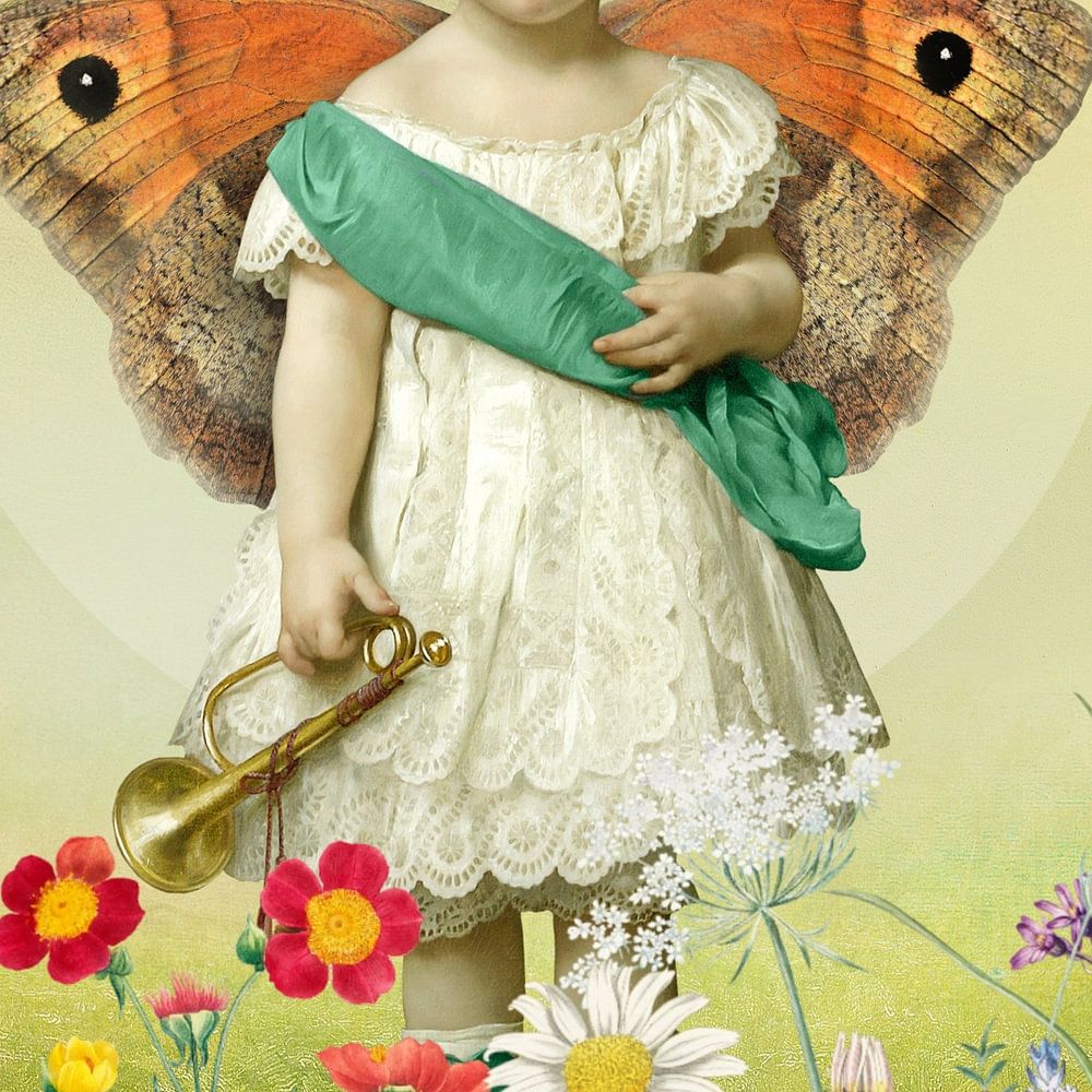Märchenhaftes, süßes und zartes Portrait eines besonderen Kindes mit Schmetterlingsflügeln und Trompete.