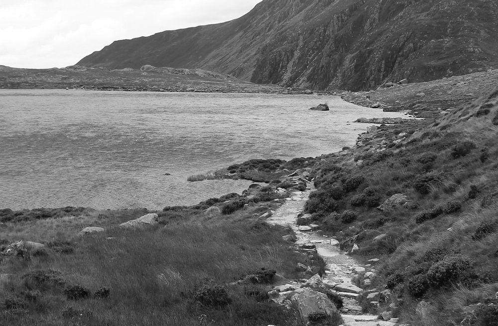 Blick auf den stimmungsvollen Llyn Idwal im Sommer im Snowdonia National Park in Wales. Der See bietet Ausblicke auf die Berge und einen beliebten Wanderweg um ihn herum. Schwarz-Weiß-Reisefotografie Großbritannien.