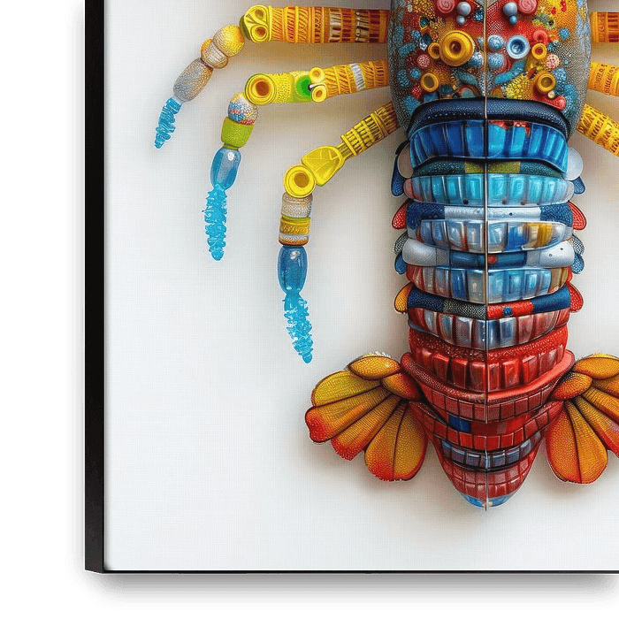 In „Recycling Lobster“ erhält die ikonische Silhouette des Hummers eine neue Bedeutung. Von oben präsentiert in einer kraftvollen, symmetrischen Komposition, besteht das Panzer aus bunten, kunststoffartigen Elementen, die an wiederverwendete Röhrchen, Perlen, Fragmente und industrielle Restmaterialien erinnern.