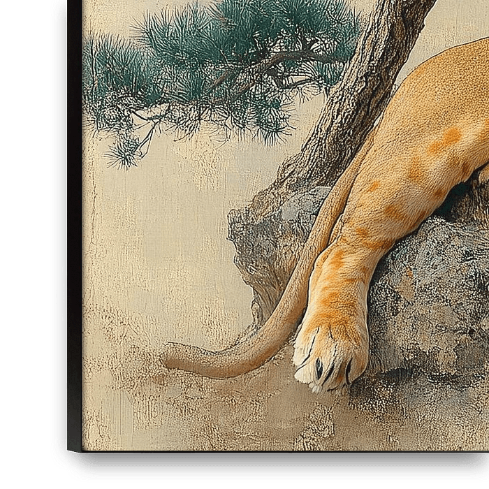 Bestelle dieses Löwen-Wandbild Löwe "In der Stille des Reichs: Der Löwe erwacht" von Niklas Maximilian als Reproduktion auf Leinwand, Alu-Dibond, als Poster, Fototapete oder Acrylglasbild.