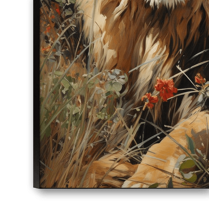 Malerische Darstellung eines Löwens, sitzend im Gras.