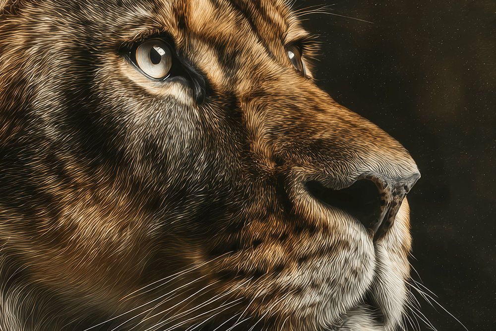 Dieses majestätische Bild zeigt einen Löwen im Profil, der in warmes Licht getaucht ist, das seine Mähne und seinen Gesichtsausdruck wunderbar zur Geltung bringt. Der dunkle Hintergrund verstärkt die Dramatik und hebt jedes einzelne Haar hervor, während sein starrer Blick Weisheit, Stärke und ruhige Führung ausstrahlt. Die Kombination aus realistischer Textur und raffinierter Beleuchtung macht dieses Kunstwerk zu einem zeitlosen Symbol für natürliche Autorität - ideal für Innenräume, die Gelassenheit und Stärke ausstrahlen sollen.