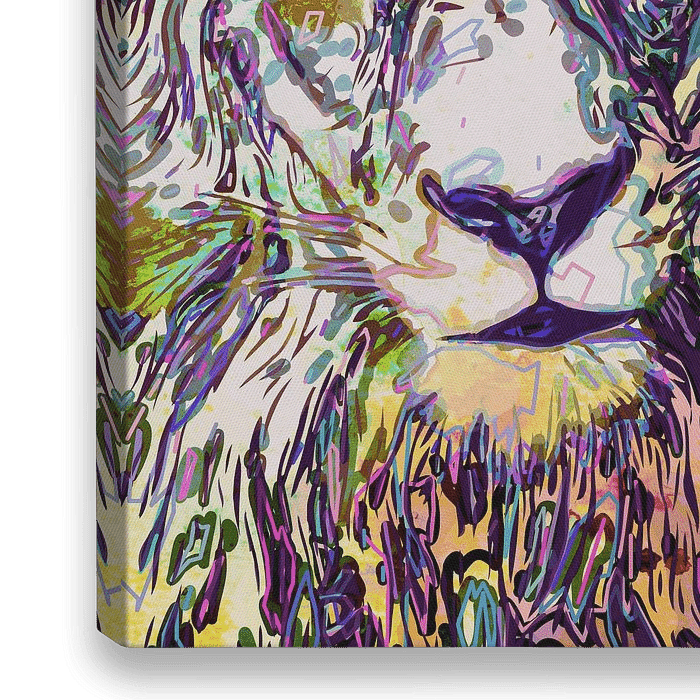 Wunderschöner Löwenkopf mit langen farbigen Mähnen. Dieses digitale Kunstwerk wird in verschiedenen Schichten erstellt. Ein echter Hingucker für Ihr Wohnzimmer oder Büro.