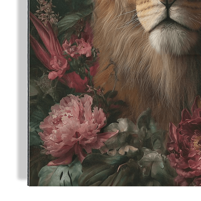 Ein beeindruckender Löwe blickt in Ihre Richtung und ist von üppigen Blumen umgeben. Das tiefe, fast samtige Fell bildet einen starken Kontrast zu den sanften Farbtönen der Pfingstrosen und anderer Blüten. Der direkte Blick verleiht dem Tier eine ruhige, selbstbewusste Ausstrahlung. Kraft und Eleganz existieren hier mühelos…