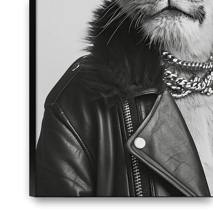 Ein monochromes Bild zeigt einen Löwen in modischer Kleidung, inklusive Lederjacke und Hut. Das Porträt strahlt Coolness und Einzigartigkeit aus.