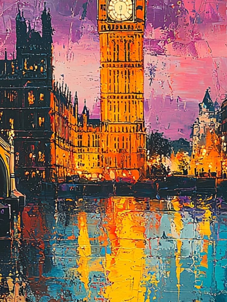 Das Gemälde fängt eine abendliche Ansicht des Big Ben und des Ministeriumsgebäudes in lebhaften Farben ein. Der Himmel leuchtet in Rot- und Violetttönen, während die beleuchteten Gebäude in Gold und warmem Gelb schimmern. Spiegelungen tanzen im dunklen Wasser der Themse, voller Farben und Bewegung. Boote gleiten wie Schatten vorbei. Die Pinselstriche sind ausdrucksstark, voller Energie und verleihen der Stadtlandschaft eine magische, fast märchenhafte Atmosphäre. London erstrahlt in diesem bezaubernden Abendlicht.