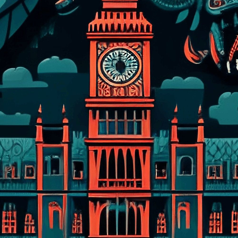 Die Farbpalette besteht aus tiefen Blautönen, Schwarztönen und feurigen Rottönen, die einen gespenstischen Kontrast erzeugen und die unheimliche Atmosphäre des Bildes noch verstärken. Scharfe, kantige Linien und komplizierte Details verleihen der Komposition ein Gefühl der Bewegung, so als ob die Stadt selbst lebendig wäre und sich verändern würde. Dieses Kunstwerk ist eine Mischung aus Fantasie und Horror und zeigt eine dystopische Vision von London, in der das Vertraute in etwas erschreckend Surreales verzerrt wird.
