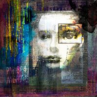 Ein Frauengesicht, blaß, eingerahmt von bunten Farben, ein Auge akzentuiert. Symbol für was wir wirklich sehen. Wo schauen wir hindurch, was übersehen wir, wo brauchen wir mehr Augenmerk ? Schau !!