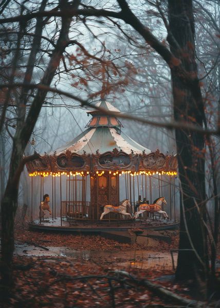 Das Bild zeigt ein altes, stillstehendes Karussell mitten im Wald. Die zart beleuchteten Lämpchen umrahmen nostalgisch die kunstvoll verzierten Holzpferde, während herabgefallenes Laub und Pfützen den Boden bedecken. Ein feiner Nebel durchzieht die Szenerie und taucht den Hintergrund in mystische Düsternis. Die Szenerie wirkt wie aus einer anderen Zeit – märchenhaft und geheimnisvoll zugleich.