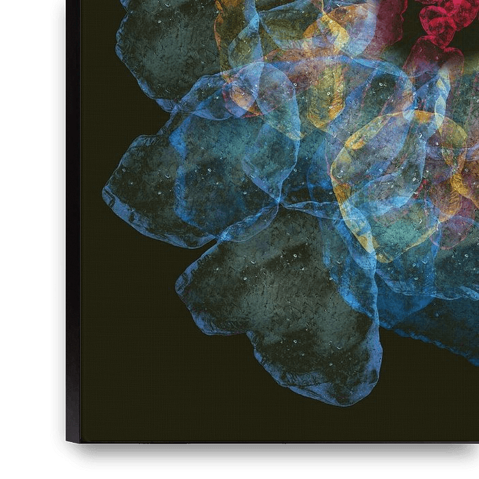 Dieses abstrakte Kunstwerk erinnert an die erhabene Form einer Lotusblüte, die sich aus einem tiefschwarzen Hintergrund erhebt.