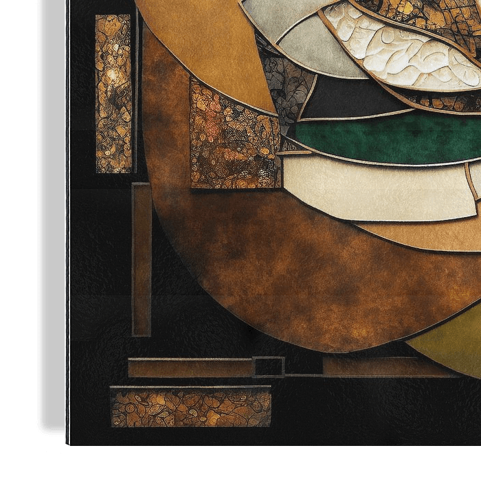 Abstrakte Collage im Stil einer Glasmalerei mit einer Lotusblume. Mischtechnik in mehreren Schichten mit Roststruktur, Ölfarbe und Papier in Erdtönen mit Goldakzent.