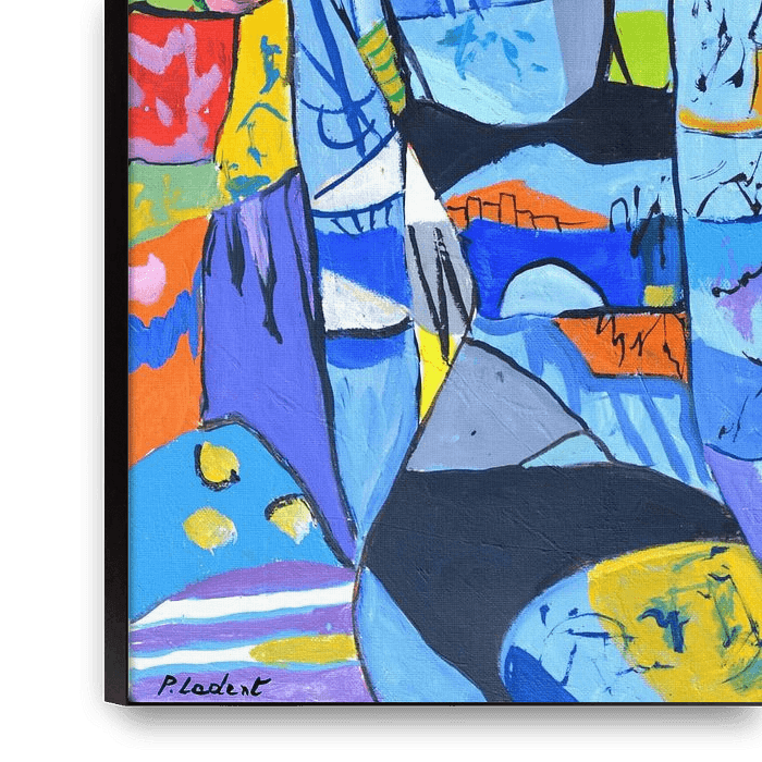 Dieses vibrierende Werk, das von einem modernen kubistischen Stil geprägt ist, zieht das Auge mit seiner kräftigen Palette und dynamischen geometrischen Formen in seinen Bann. Im Vordergrund zeigt eine stilisierte weibliche Figur, von hinten betrachtet, eine bläuliche Haut, die einen meisterhaften Kontrast zu den ineinandergreifenden…