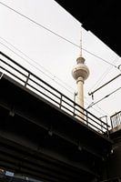 Blick durch zwei Eisenbahnbrücken am Bahnhof Alexanderplatz in Berlin auf den Fernsehturm, das Wahrzeichen der deutschen Hauptstadt. Touristen aus aller Welt nutzen Berlin und seine Sehenswürdigkeiten als beliebtes Reiseziel.