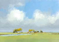 Lucht Bomen | Adem - De eerste indruk is meteen lucht — een enorme ruimte van zacht kobaltblauw die overgaat in grote, wollige wolkenvulkanen. Dit is een lucht schilderij waarin de hemel de hoofdrol speelt: brede, zilte penseelstreken vormen stapelwolken die lijken te zweven boven alles wat onder hen ligt. De kunstenaar heeft de lucht…
