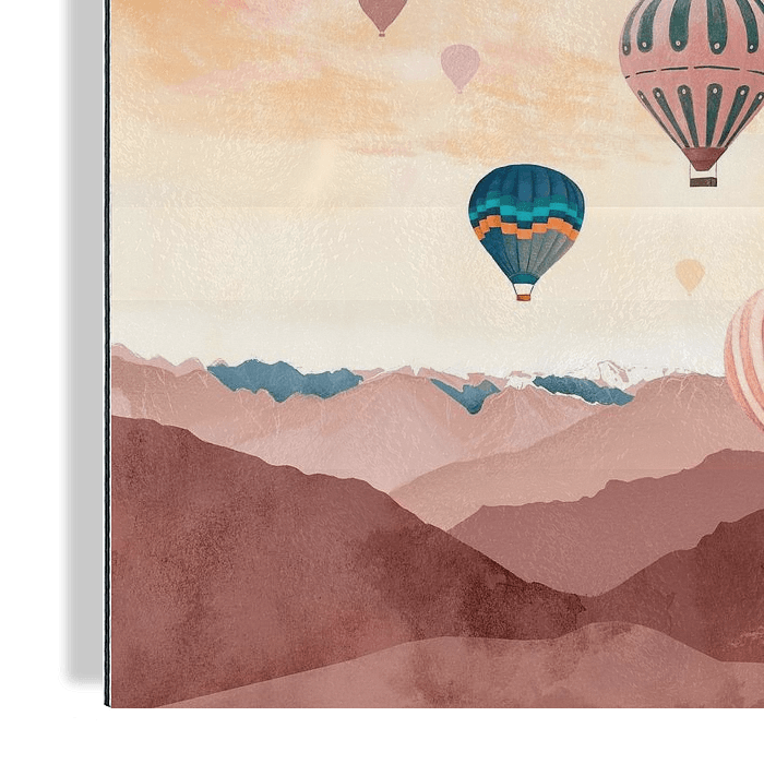 Eine Illustration, in der man sich verlieren kann! Eine Berglandschaft, die sich vor einem Himmel in den Farben der untergehenden Sonne abzeichnet. Viele Luftballons in schönen Farben schweben durch das Bild. Das Abenteuer kann beginnen!