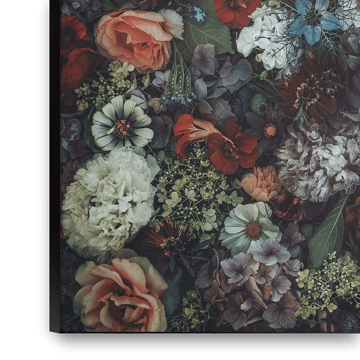 Ein üppiges, von der bildenden Kunst inspiriertes botanisches Werk, bei dem verschiedene Blumen flach auf einem dunkel strukturierten Hintergrund liegen. Rosen, Hortensien, Kosmos, Mohn und verschiedene Elemente bilden ein atemberaubendes, reichhaltiges Werk, das jeden Innenraum bereichern wird